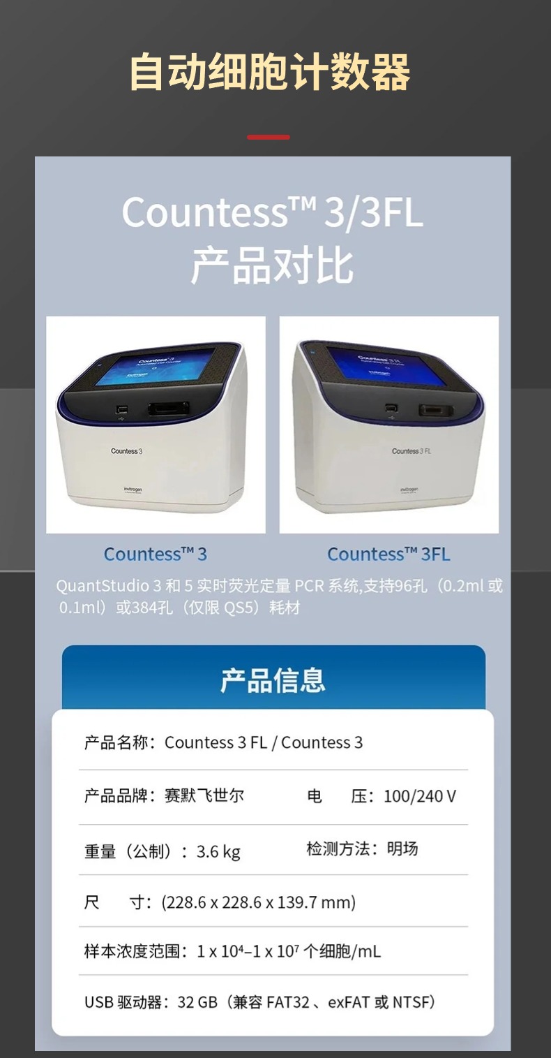 賽默飛(Thermo Fisher Scientific)的Countess 3是一款自動細胞計數儀,為細胞生物學研究提供了快速、準確的細胞計數和評估解決方案。以下是對Countess 3自動細胞計數儀的介紹: